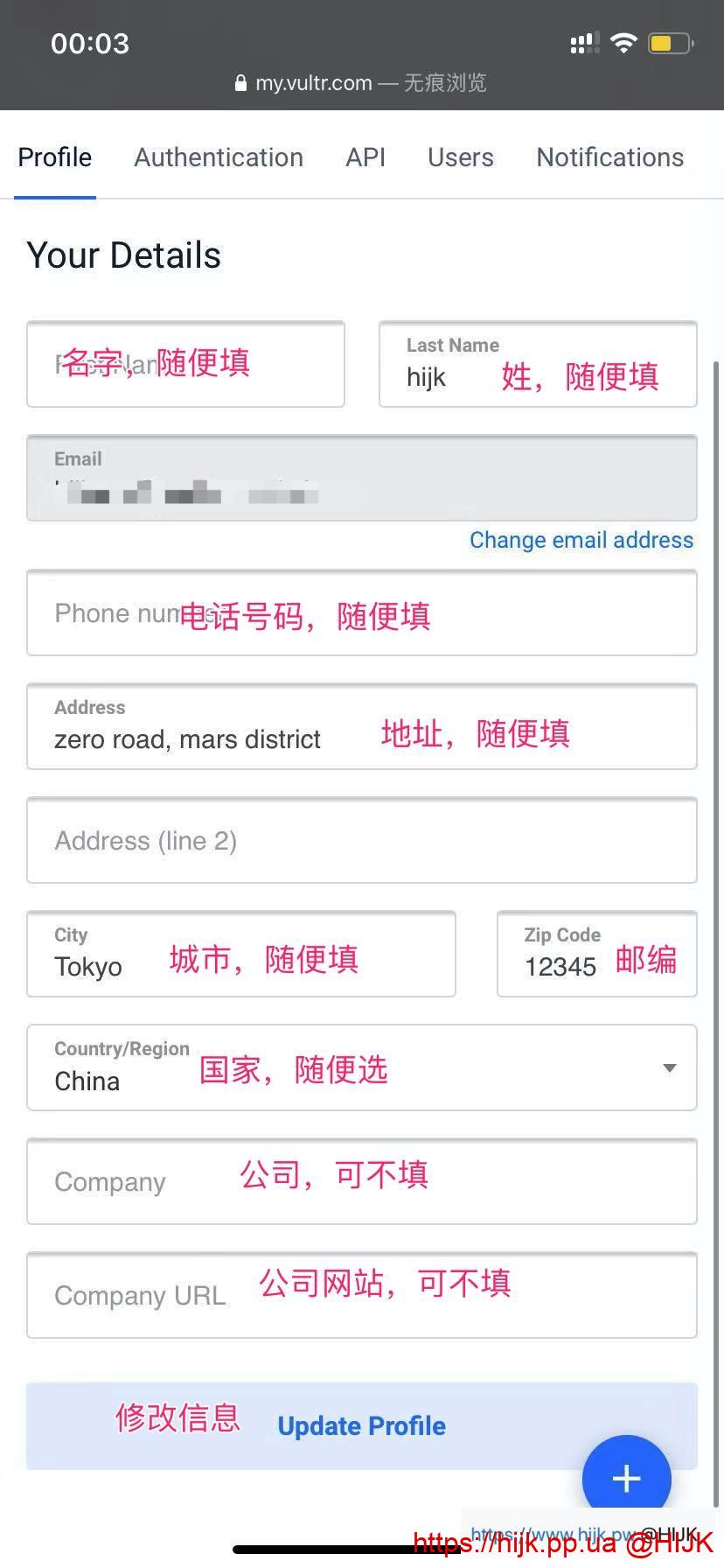 2. 点击右上角的菜单,选择“account”。在profile标签中,可以随便输入名字(first name),电话号码(phone number)以及其他信息。这样在其他界面就不会有烦人的提示补充信息的消息了: