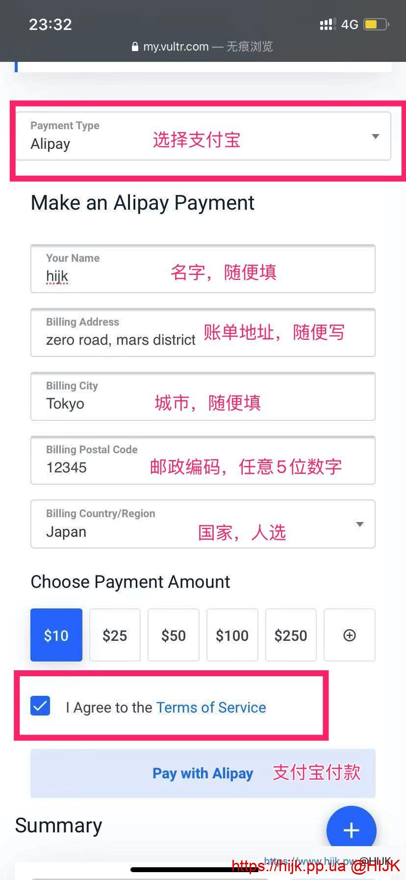 注册成功后,跳转到充值页面。支持支付宝(Alipay)、微信支付(WeChat Pay)、信用卡(Credit Card)等多种方式,绑定信用卡或者Paypal账户可享受充10刀赠送100刀。账单信息随便填写名字(your name),账单地址(billing address),任意选择一个城市(billing city),随便填一个5位数字邮政编码(billing postal code),随便选一个国家(billing country region),勾选同意协议(I Agree to the terms of service),点击下方的“pay with XXXX”付款按钮: