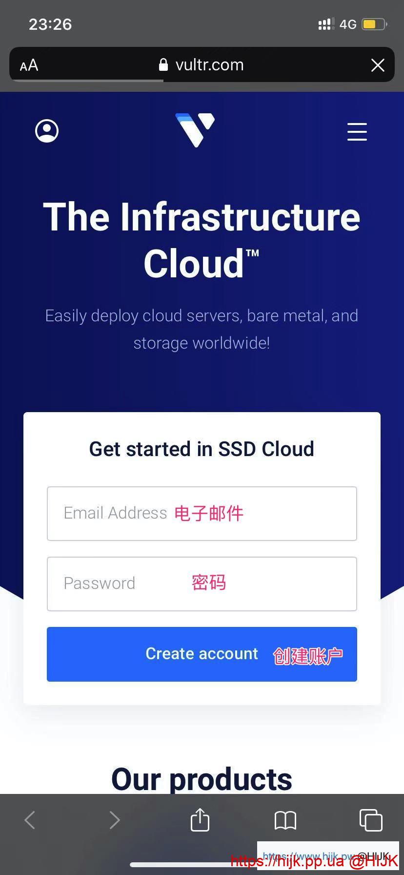 点击 vultr官网 这个链接打开官网,在主界面的表单里输入电子邮件和密码,然后点击创建账户按钮。注意:账户密码要求同时包含数字、小写字母,大写字母,并且不低于10个字符:
