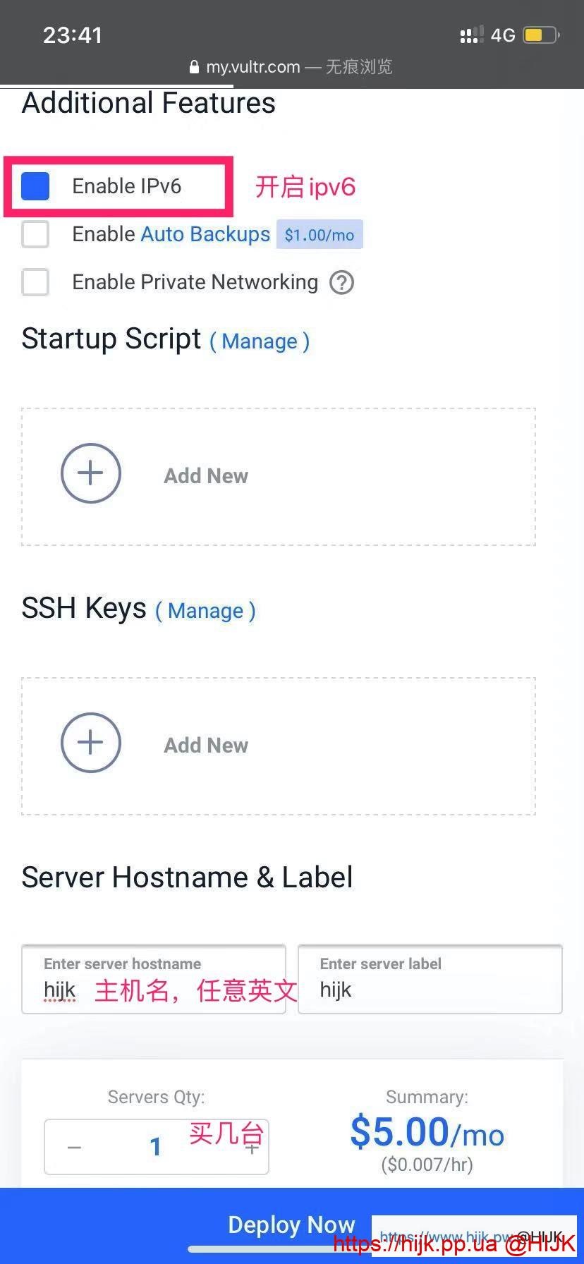 最后是设置主机名(可不填,默认为vultr),确认数量和价格,没问题的话点右下角的“deploy now”按钮创建服务器:
