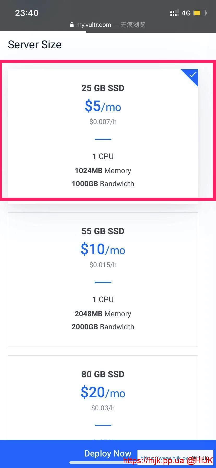 继续往下滑,进入选择服务器配置(server size)界面。如果是搭梯子上外网,5刀每个月的服务器基本就够用,包含1个cpu,1GB内存和1T流量(注意:2.5刀每个月的服务器并不是在每个机房都有,如果你需要请在上一步切换机房位置):