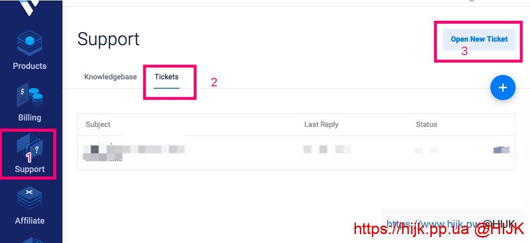 - 在个人中心点击左边的 ”Support“, 接着点击 “ticket” 标签页,然后页面右上方点击 “Open New Ticket” 按钮创建新工单: