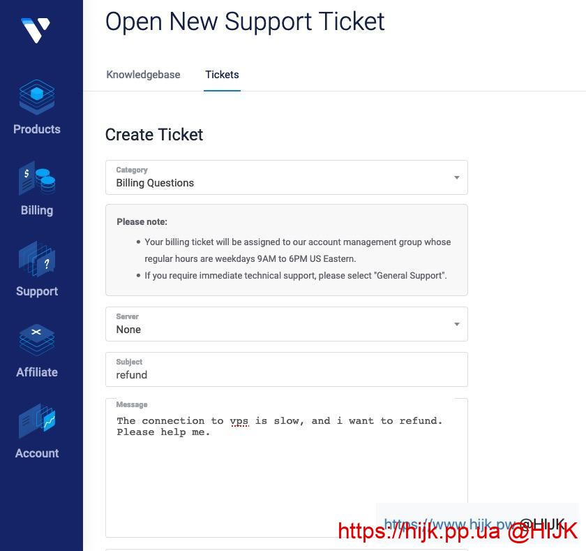 2. 填写退款申请表。“category” 选 “Billing Questions”,“Server” 不用选,在 “Subject” 填 refund 或类似退款的单词/句子,“Message” 框里写退款说明,例如:The connection to vps is slow, and i want to refund. Please help me.