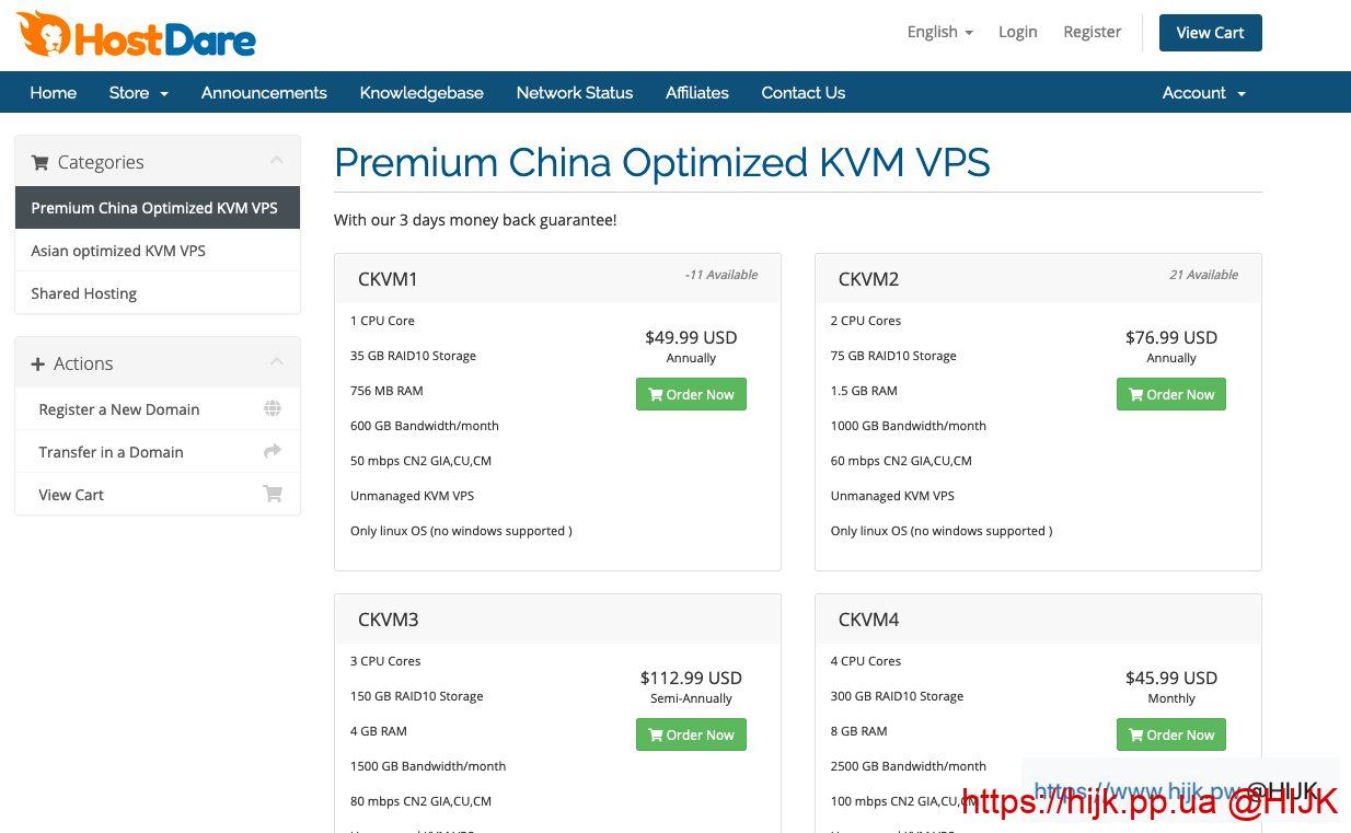 HostDare 是一家美国的vps服务商,官网是:https://manage.hostdare.com。因其客户多为中国人,因此机房针对中国地区的网络做了优化,电信走CN2 GIA/GT线路,联通和移动直连,速度上很不错。 HostDare 所有VPS提供3Gbps的免费DDos防护,价格月均不到4刀起,支持支付宝,对国内用户友好。