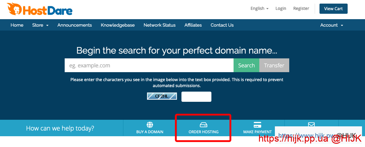 首先打开 HostDare官网,点击下面导航菜单的“ORDER HOSTING”: