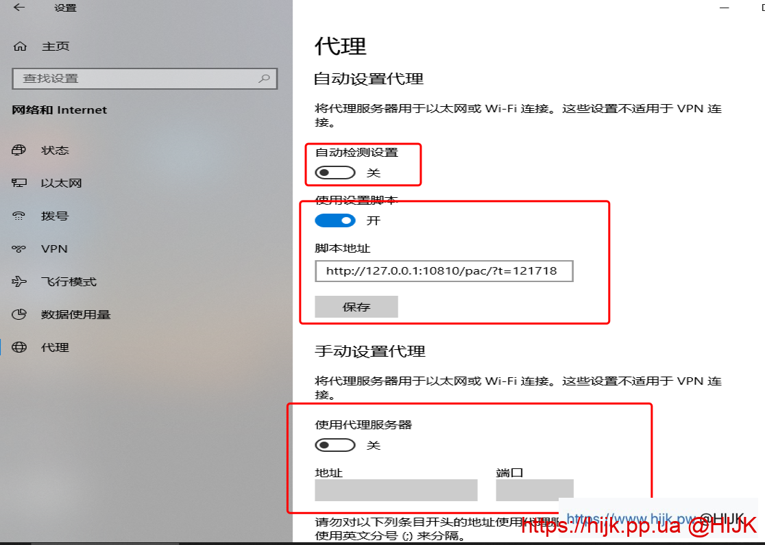 打开windows设置,找到“网络和internet设置” -> “代理”,pac模式下画风应该是这样的: