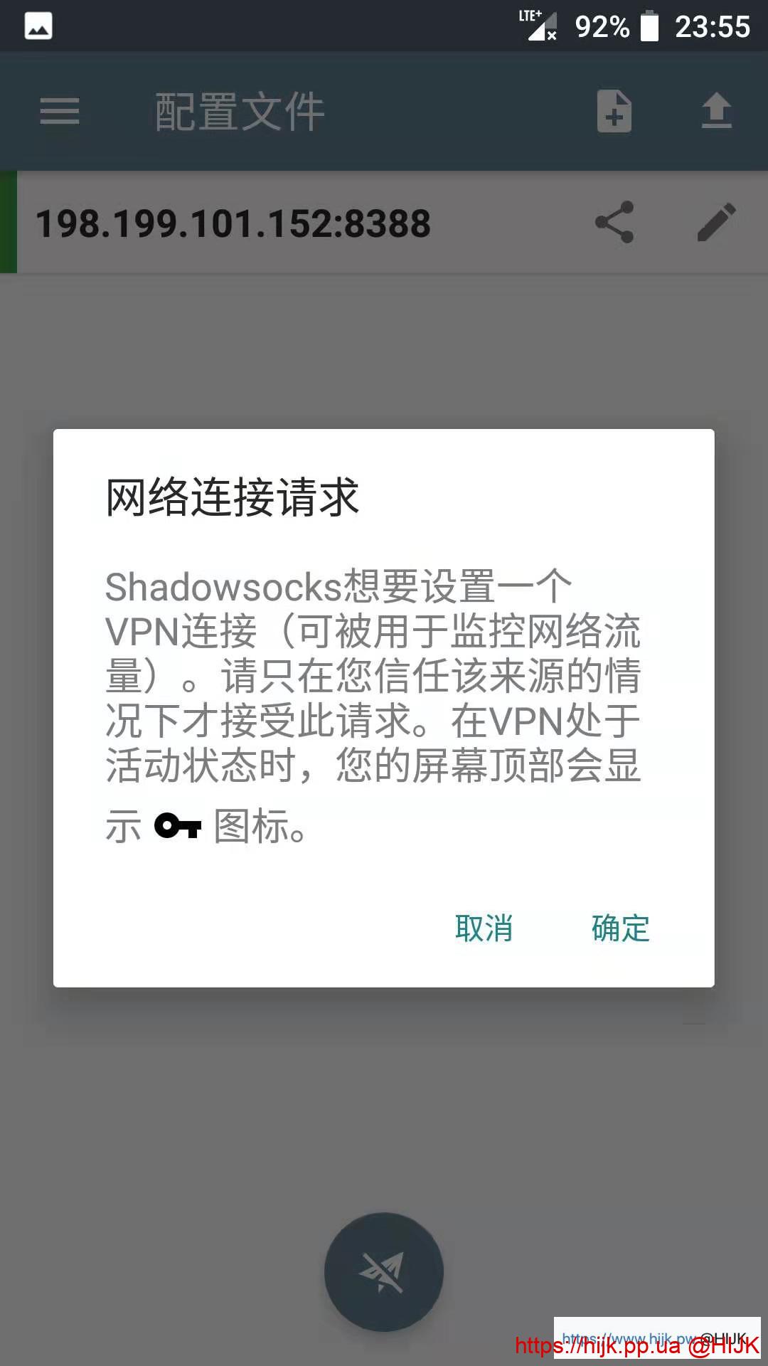 5. 信息填写完毕后按右上角的勾保存设置。回到主界面,点下方的小飞机图标,如果出现网络请求提示,按确定: